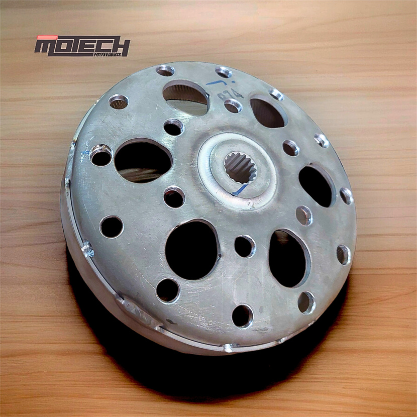 Kedua: Clutch bell (mangkok kampas ganda) dicustom lubang menggunakan dividing head dgn pengaturan tiap lubangnya menggunakan derajat, sehingga jarak antar lubang akan sama dan juga permukaan pad mangkok ganda bisa dibuat kasar biasa disebut knurling / kartel